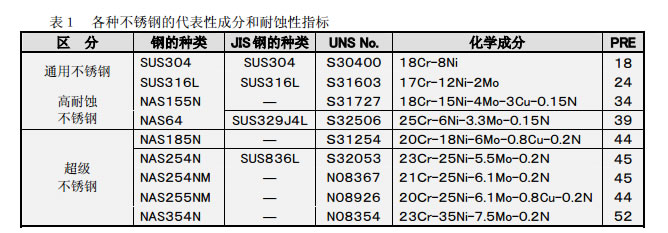 表1表示各種不銹鋼的化學成分和 PRE 值,NAS254N 和 NAS354N 的 Cr、Mo、N 含量高的,在不銹鋼